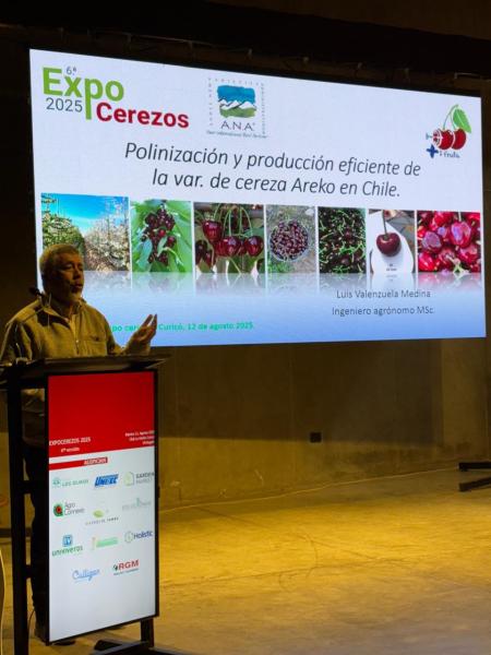 Por su parte, el especialista Luis Valenzuela, profundizó en el manejo productivo de Areko cv., recalcando que su éxito productivo depende de un manejo preciso en cuanto a la polinización y del control de vigor. Areko cv. es autoinfértil (S1S3) y requiere polinizantes compatibles como Kordia, Skeena o Santina, cuya distribución óptima varía según la zona agroclimática. En zonas cálidas, por ejemplo, se recomienda no más de dos hileras consecutivas de Areko cv. y una combinación de Santina y Skeena para maximizar la visita de abejas y la cuaja efectiva.